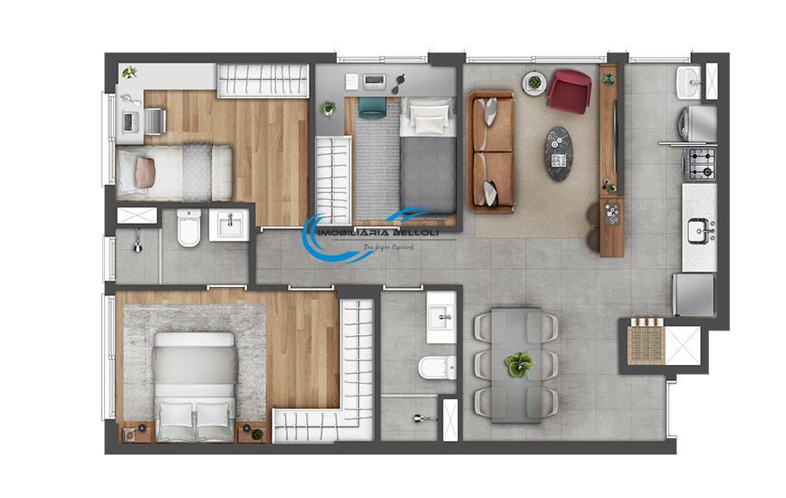 Apartamento com 03 dormitórios, sendo 01 suíte, 01 vaga de garagem escriturada, sala, sala de jantar, 01 banheiro social, cozinha com área de serviço e churrasqueira.