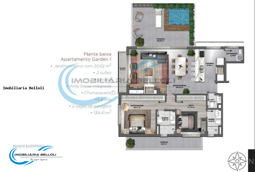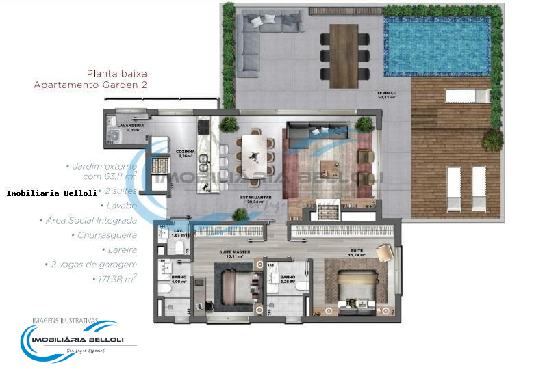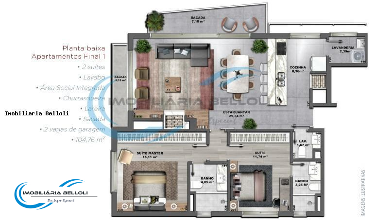 O apartamento possui uma linda área social integrada com a cozinha e churrasqueira, uma lareira incrível para que possa desfrutar com sua família, acompanhado de uma vista incrível com duas sacadas separadas, duas suítes com banheiros exclusivos, um lavabo e uma área de serviço.